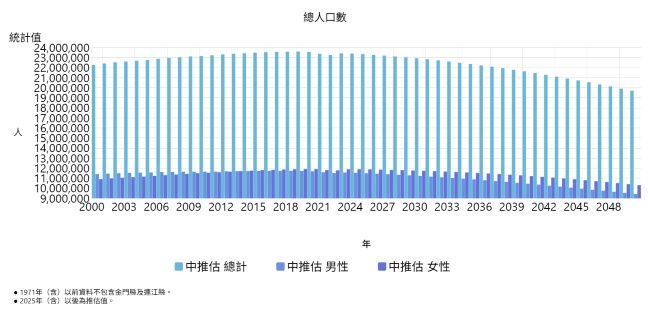 • 根據國發會預估,2050 年人口可能跌破 2,000 萬人;